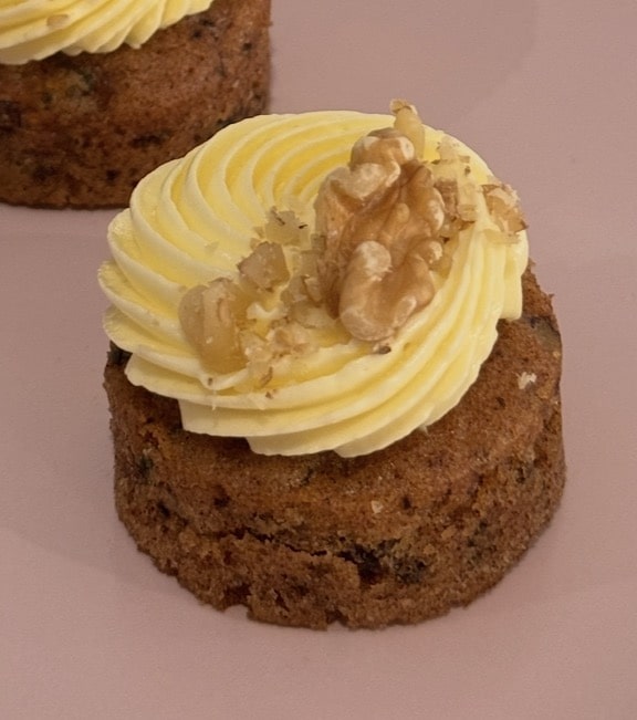 Naar eigen recept gemaakte carrotcake met daarop een rijke topping van mascarponecreme en walnoten.