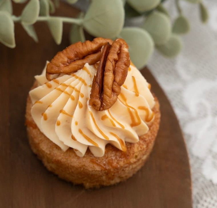 Een knapperige bodem met pecannoten en kaneel, gevuld met huisgemaakte karamel en een heerlijke karamelcreme.