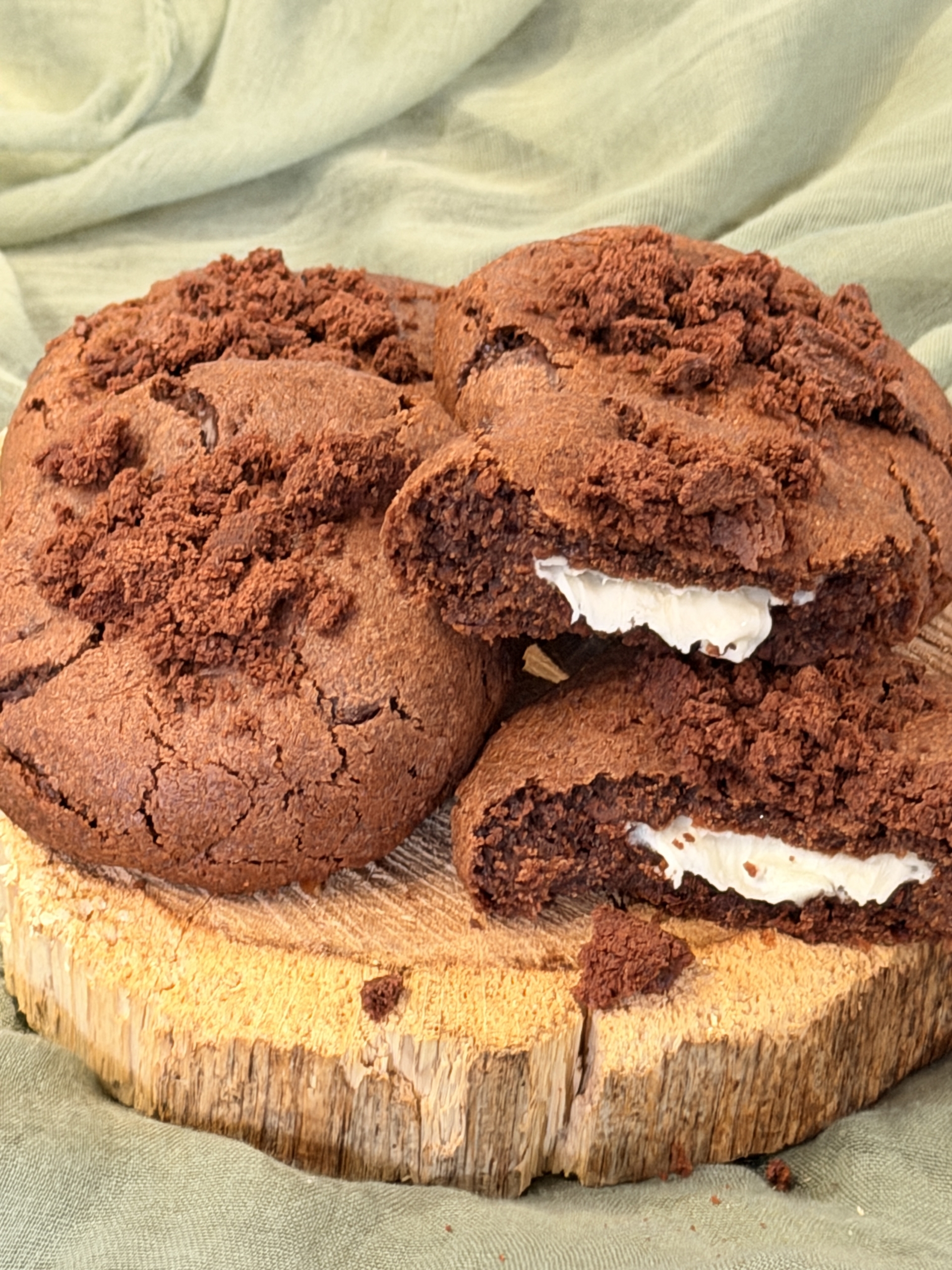 Een feestelijke verzenddoos gevuld met 6 knotsen van koeken in de smaak witte chocolade/cranberry en brownie/marsmallow