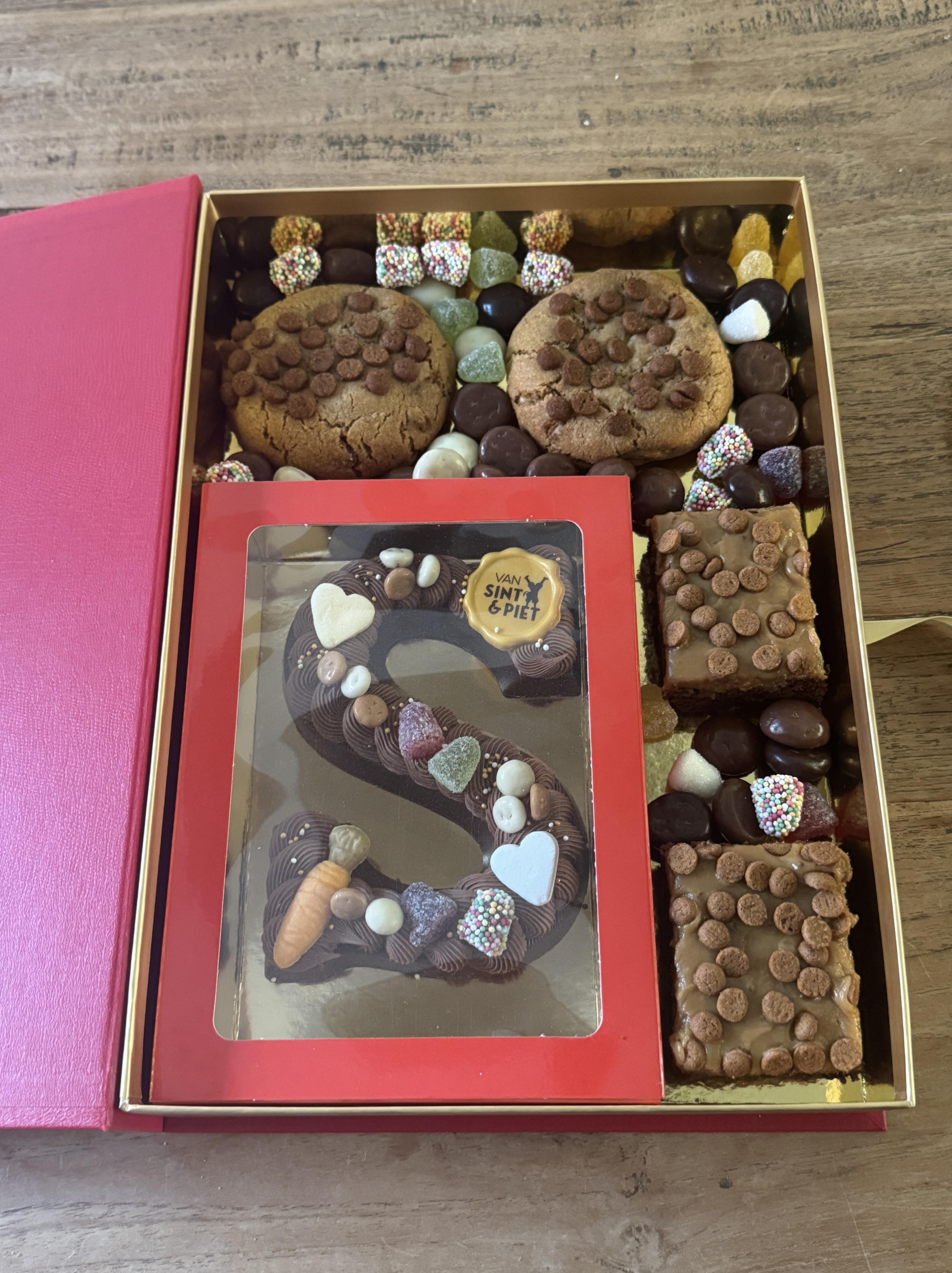 Een groot boek van sinterklaas gevuld met een luxe chocoladeletter, 2 speculoos brownies en 2 van onze heerlijke peternootkoeken. De doos wordt gevuld met pepernoten en schuimpjes om het helemaal af te maken!