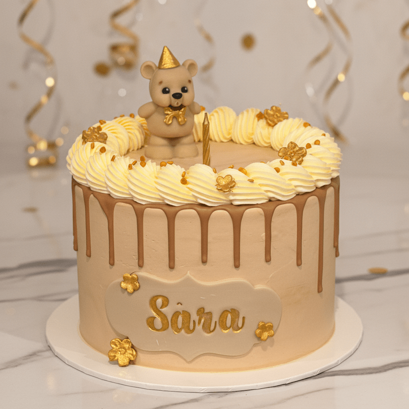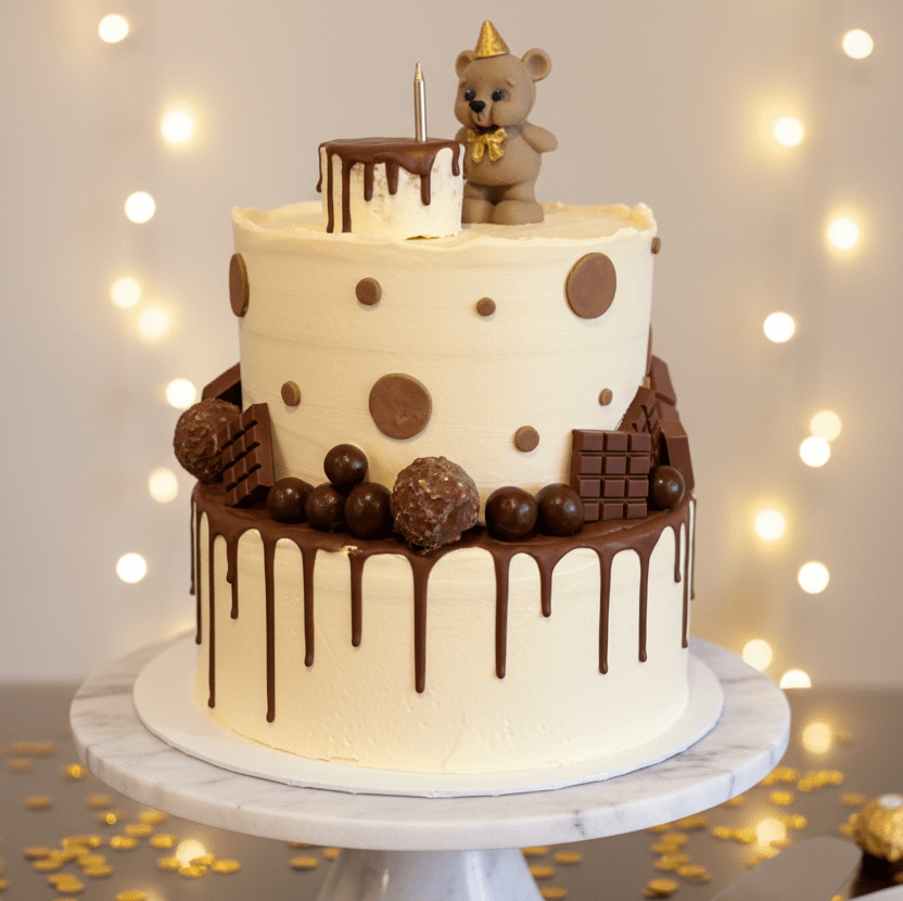 Deze taart is gewoon té leuk om niet te delen. Elke willekeurige kleur is mogelijk. De taart wordt mooi afgewerkt en bovenop een schattig chocolade beertje met feesthoedje – klaar voor elk feestje 🎉